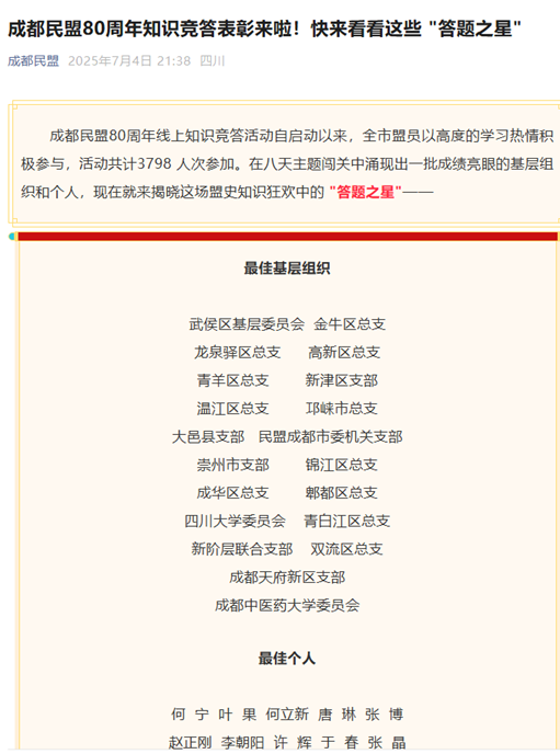 民盟bevictor伟德总支主委于春在庆祝成都民盟成立80周年系列活动中获得知识竞答“答题之星”(最佳个人)。其撰写的现代诗《在bevictor伟德 我与民盟同行》在“我与民盟”征文活动中荣获优秀作品。